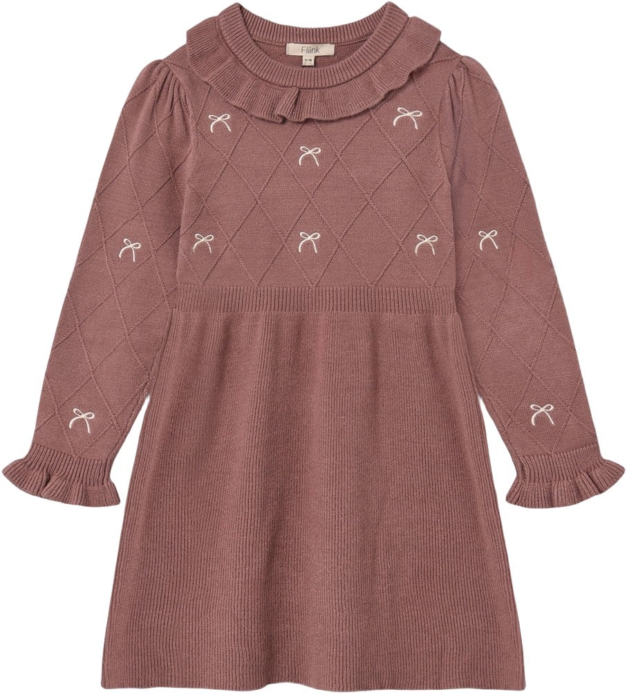 Fin strikket kjole i en støvet rosa nuance, dekoreret med små sløjfer og en feminin flæsekant ved halsudskæring og ærmeåbning. Kjolen har lange ærmer og skærer ved taljen, hvor ribben giver en volumen og feminint udtryk. Ideel til brug af både hverdag og