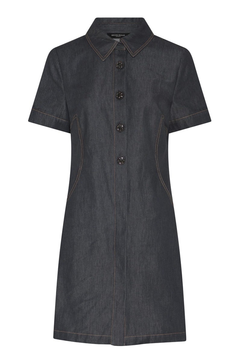 Denne denimkjole har et klassisk skjortesnit med korte ærmer og gennemknapning, der giver et tidløst og cool udtryk. Den mørke vask og de synlige kontrastsyninger fremhæver detaljerne og skaber en flot silhuet. Kjolen er nem at style både til hverdag med