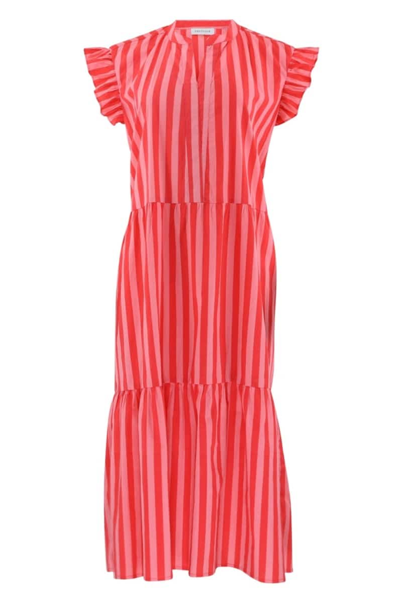 En sød kjole fra Continue i en let og luftig pasform og de flotteste sommerfarver. Denne kjole syner af flere lag og har flotte flæser ved skuldrene. Style den til et par sandaler – både til hverdag og fest!