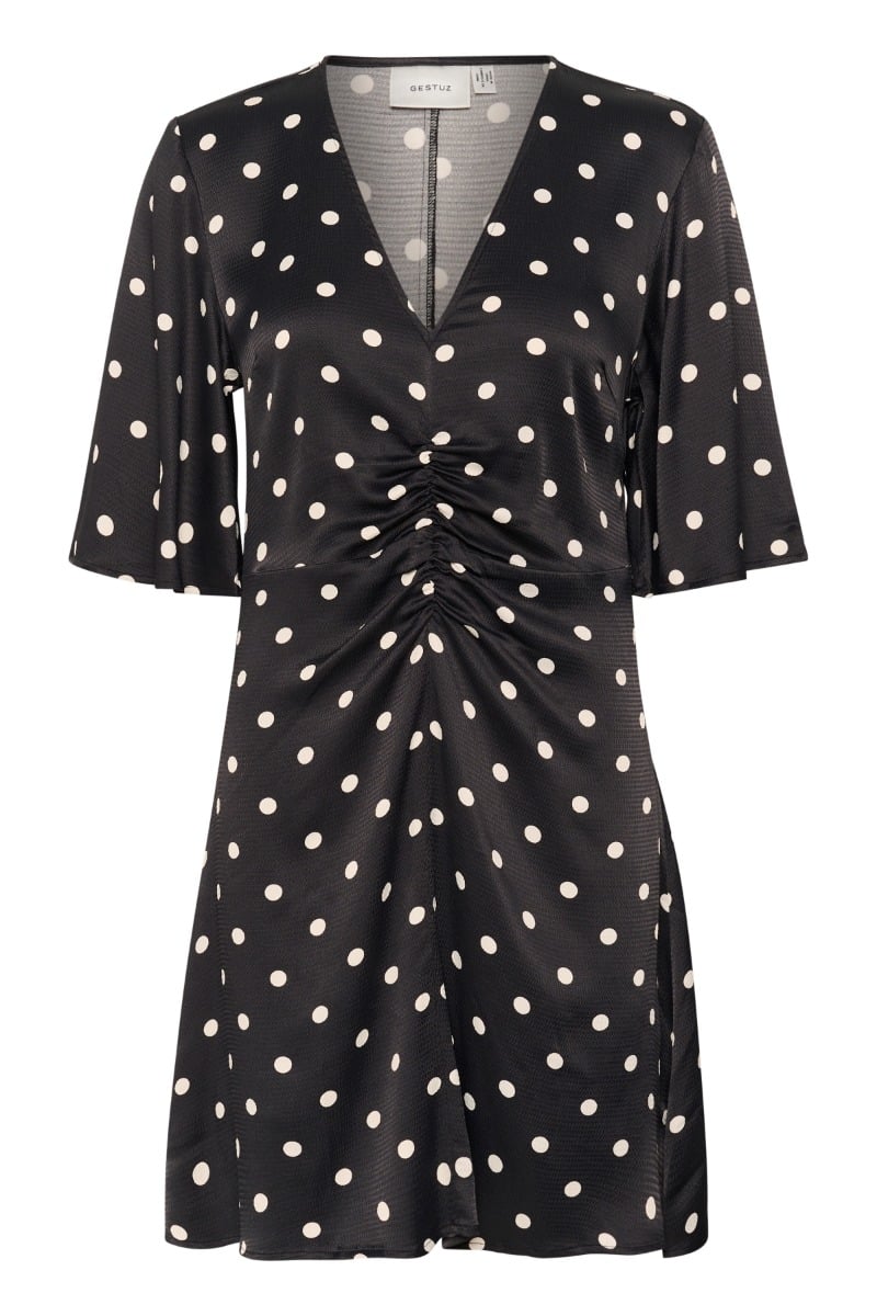 En super fin kjole fra Gestuz i flot design. Kjolen har en sort baggrundsfarve med hvide polkaprikker. Den har v-udskæring og en flot pasform. Den kan nemt style både til hverdag og fester.