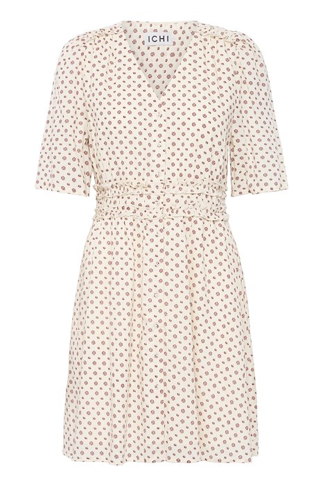 Kjole fra Ichi. Kjolen har et feminint og sødt design med små blomster. Den har korte ærmer og v-udskæring. Det er en nem hverdagskjole, som har en let kvalitet.