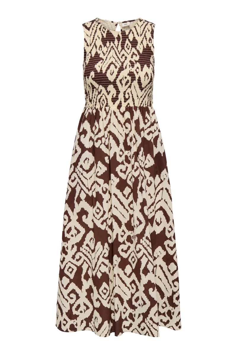 En sød kjole fra JDY er kommet i denne model med smock i overdelen og med A snit i underdelen som giver et flot og let udtryk. Den er hvid i bundfarven med brunt mønster som ikke står så hårdt op mod hinanden og derfor også fin til hverdag med en sandal e