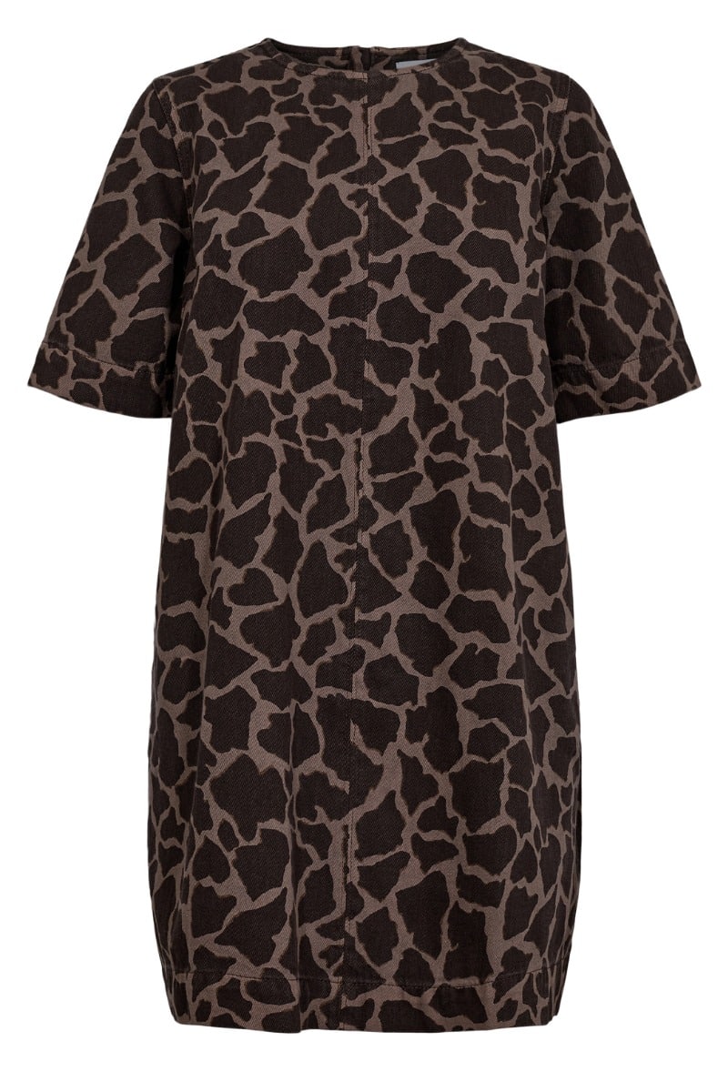 Enkel og feminin kjole fra Nümph. Denne kjole har en løs og afslappet pasform, og passer de fleste kropstyper! Den har et enkelt design i sort og brun. En kjole som nemt både kan styles til hverdag samt særlige anledninger.