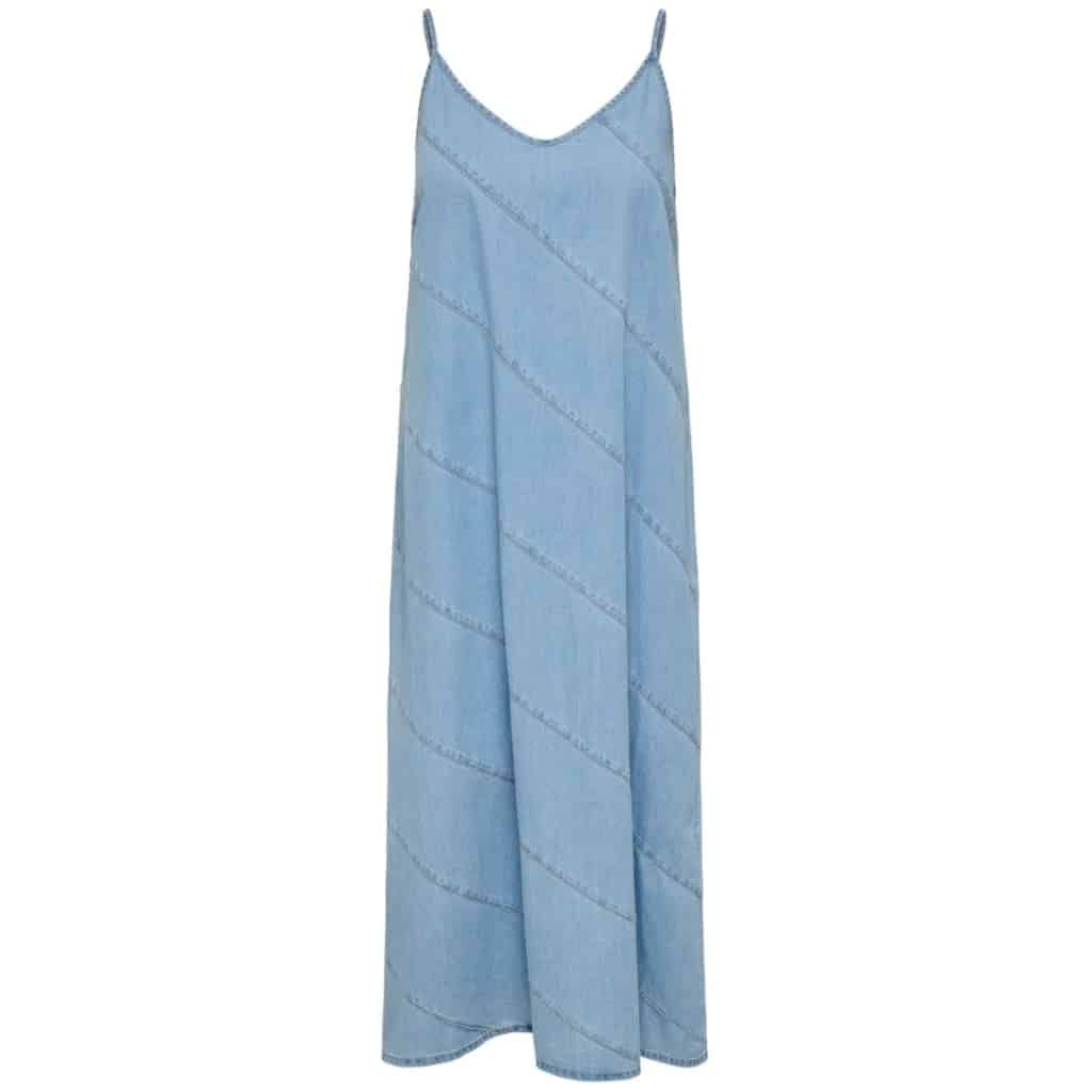 Smuk kjole fra Only i denimlook. Style til hverdagen med et par sandaler og basis cardigan. Eller style med et par stiletter og blazer til sommerens fester. – V-udskæring- Tynde stropper – Denim lookMateriale: 100% bomuld