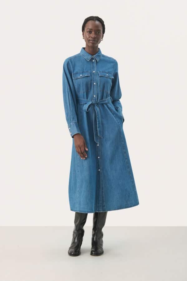 Modellen er 180 cm høj og iført størrelse 36. Denne klassiske skjortekjole i denim er en alsidig tilføjelse til garderoben. Med bindebælte i taljen og brystlommer skaber den et flatterende og afslappet look. Perfekt til både hverdag og weekend, hvor den n